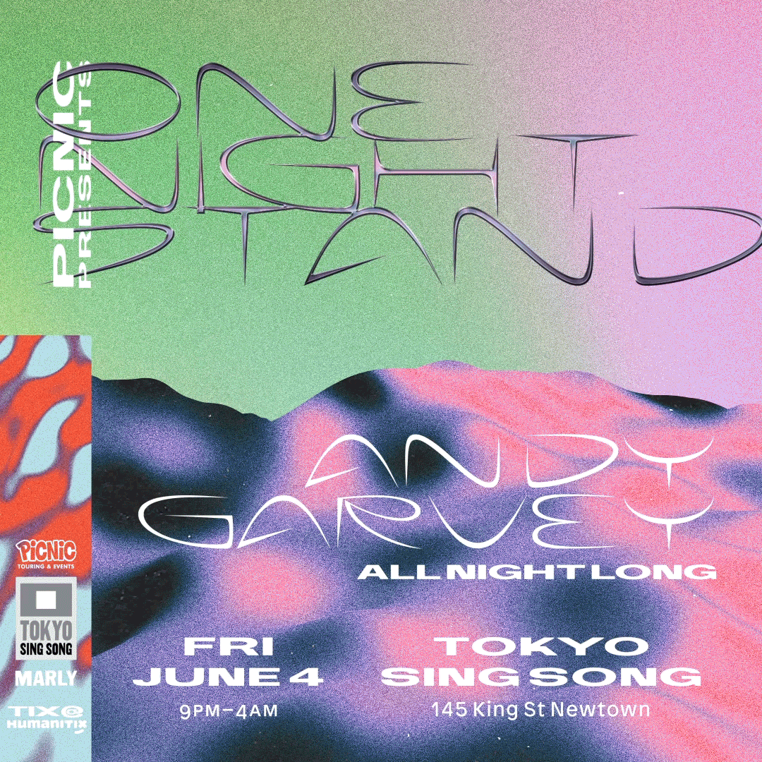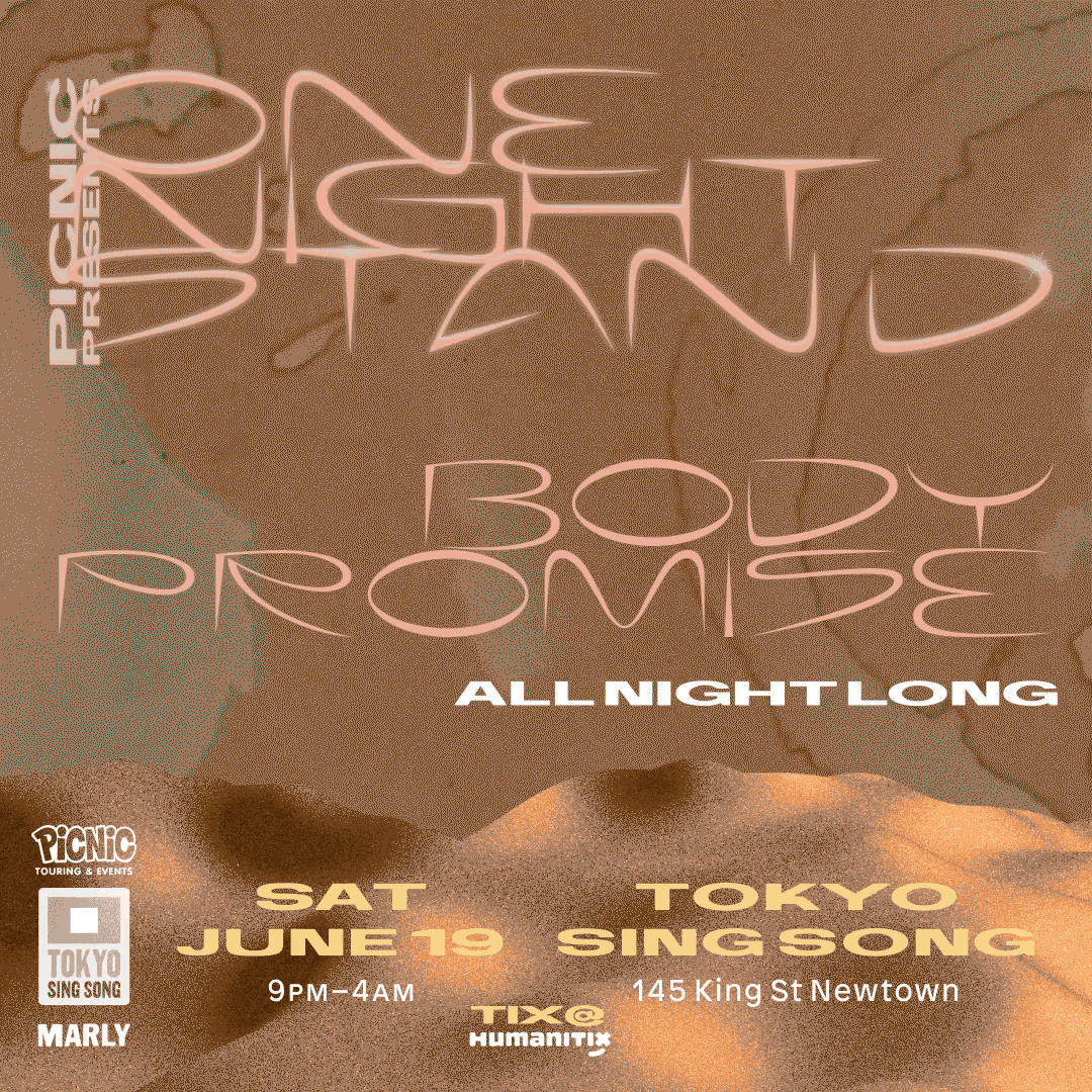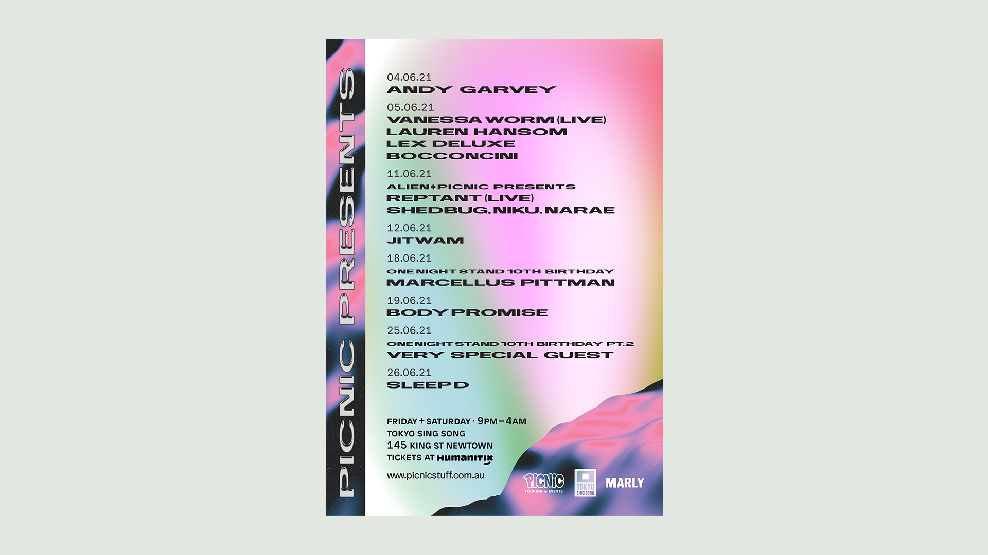 Typography treatment, weekly flyer design with moving elements and a print component for tastemaker Sydney party starters Picnic.