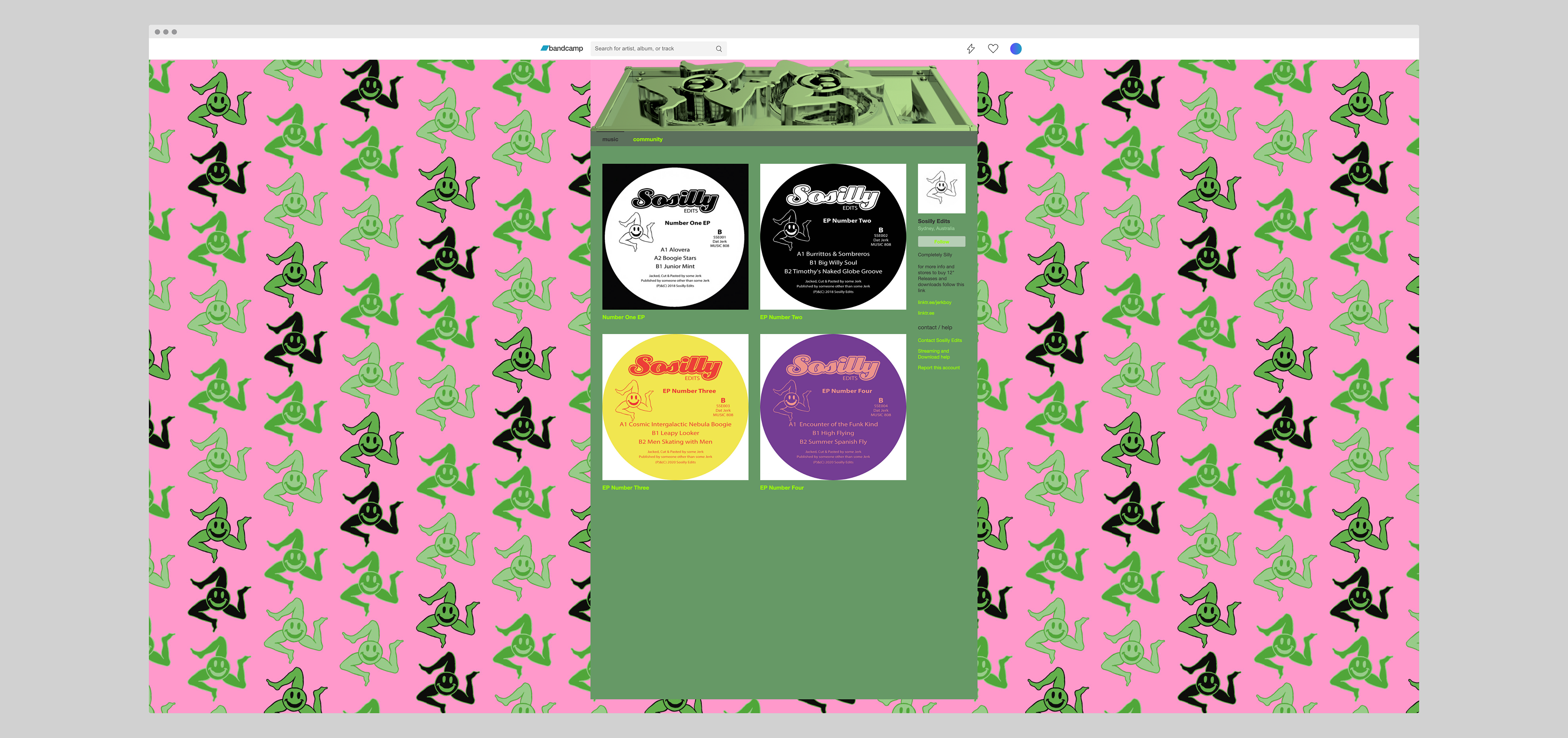 Merch and custom Bandcamp layout using playful spins on existing logo for record label Sosilly.